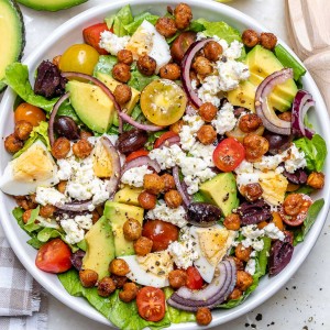 - Place your choice of favorite greens into a large bowl and top nicely with crispy chickpeas, cherry tomatoes, onions, avocado, olives, feta, and hard boiled eggs. OR divide ingredients evenly between 4 separate serving bowls.