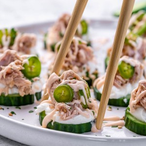 - Lightly drizzle this homemade spicy mayo over your tuna cucumber bites. I snipped off a teeny tiny corner of a bag then filled it with my spicy mayonnaise to get this nice even drizzle.
