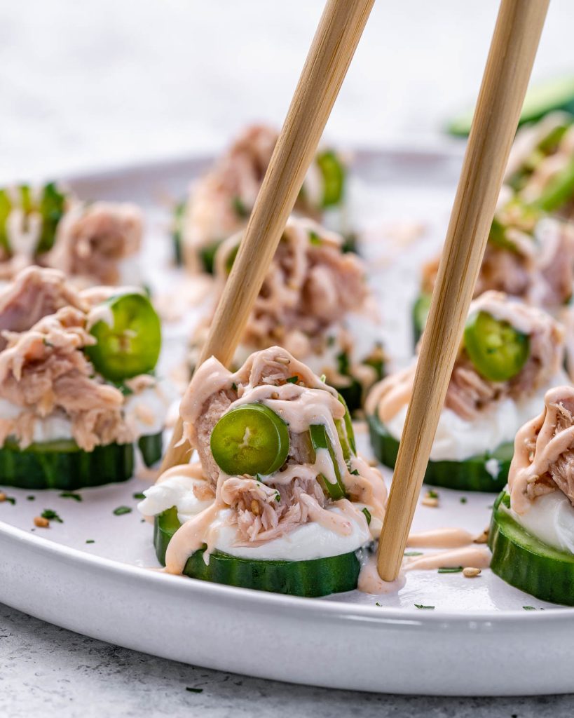 - Spread each cucumber with about 1 teaspoon of cream cheese, a small spoonful of tuna, jalapeño slices as desired, and a tiny sprinkle of sesame seeds.
