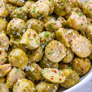 - As soon as your sprouts are ready and tender-crisp, carefully transfer to a large bowl then add the clarified butter, garlic, parmesan cheese and parsley and toss to melt the butter and coat. Season with sea salt and pepper to taste.
