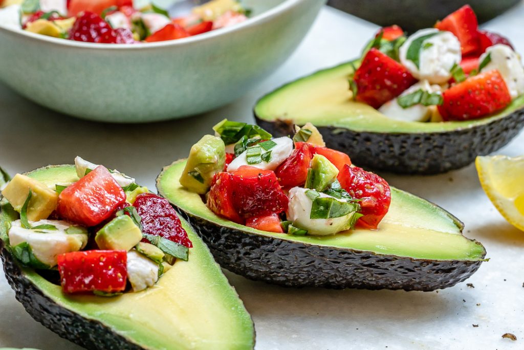 - Chop the scooped avocado flesh and place it in a bowl together with the chopped strawberries, mozzarella, fresh basil, olive oil and lemon juice. Season with a pinch of salt and gently toss.