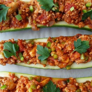 - 3 medium zucchini, cut in half lengthwise, most of flesh scooped out. Sometimes I brush zucchini flesh lightly with extra virgin olive oil, & sprinkle with garlic powder.