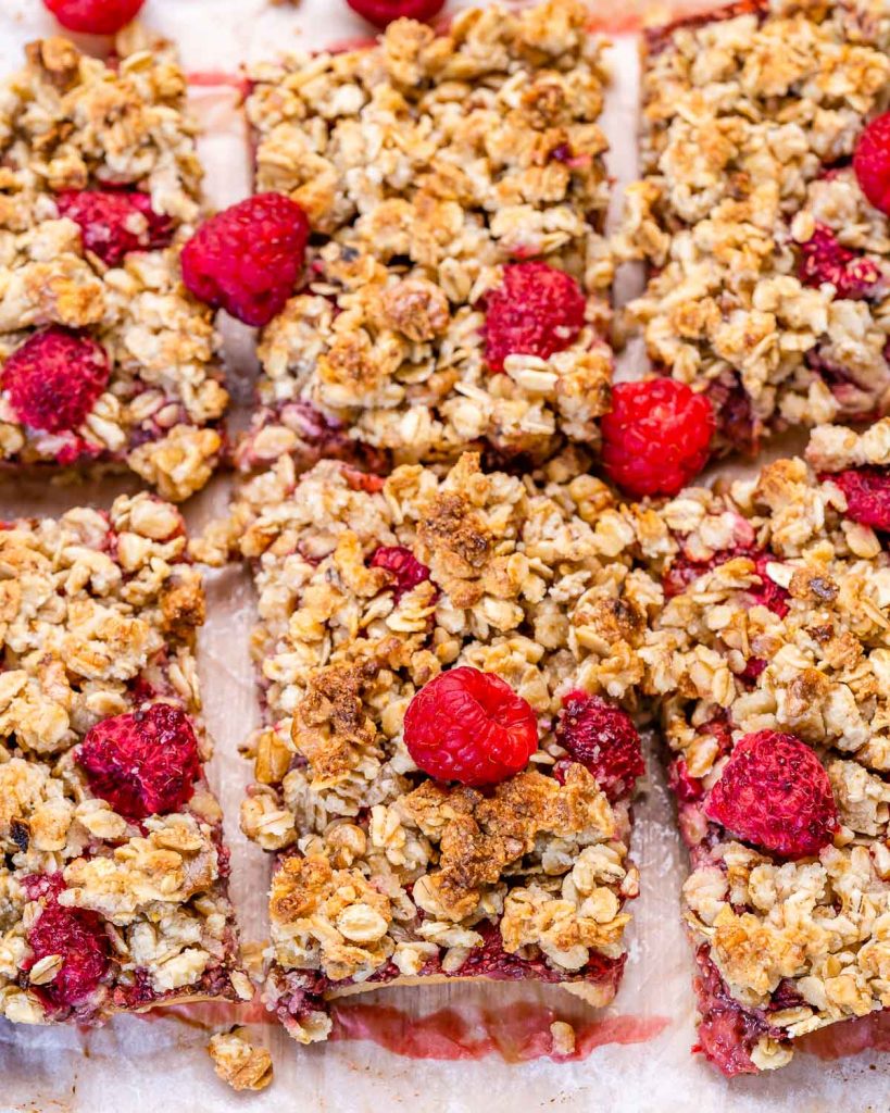 - Sprinkle this crumb mixture evenly over your strawberry jam filling. Top with fresh raspberries as desired.