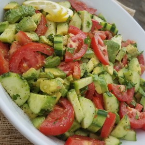 Summer Tomato Avocado Salad w/ our favorite homemade Greek dressing.
