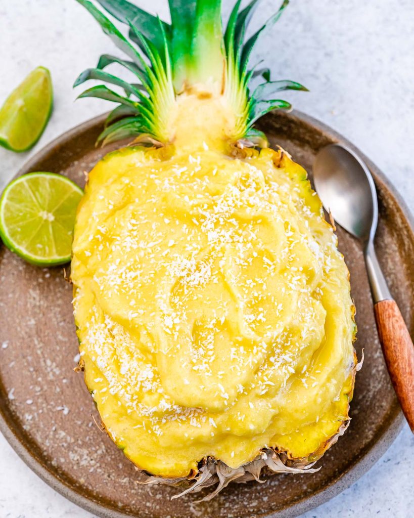 - Transfer your soft serve into your frozen pineapple bowls and sprinkle with shredded coconut or fresh lime zest if desired.