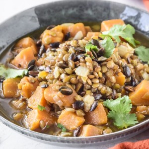 Add in your rinsed lentils, bay leaf, and broth. Bring to a boil, then reduce heat to medium-low, cover, and simmer for 20-30 minutes or until sweet potato and lentils are tender.