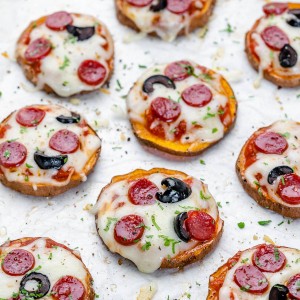 - Carefully remove from the oven and top your sweet potato slices with a spoonful of marinara or pizza sauce as shown, some shredded mozzarella, a pepperoni or two, and olives.