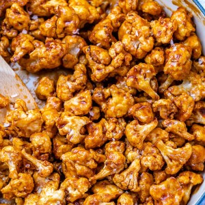 - Once the cauliflower is finished baking, transfer to the skillet. Toss with the sauce over medium heat, stirring constantly, allowing it to absorb the sauce, for a minute.
