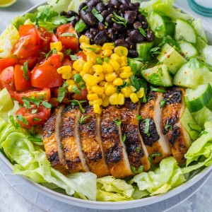 - Slice cooked chicken breasts, add to top of salad.