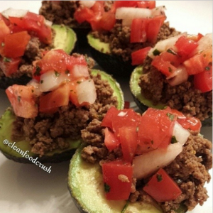 - Fill the avocado halves with taco meat (this is free range bison….use your fav)