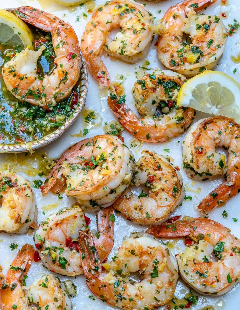 - Transfer your cooked shrimp to a large platter and immediately serve with remaining untouched Chimichurri sauce and additional fresh lemon wedges.