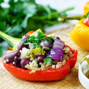 Divide this mixture equally amongst your roasted pepper halves until they are each nicely stuffed with the filling, then bake for 5 more minutes.