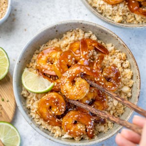 These Teriyaki Shrimp Bowls are loaded with tasty cauliflower “rice” which makes for a really delicious, satisfying, nutritious, and SUPER quick meal to eat immediately; but they’re also perfect for meal prep!