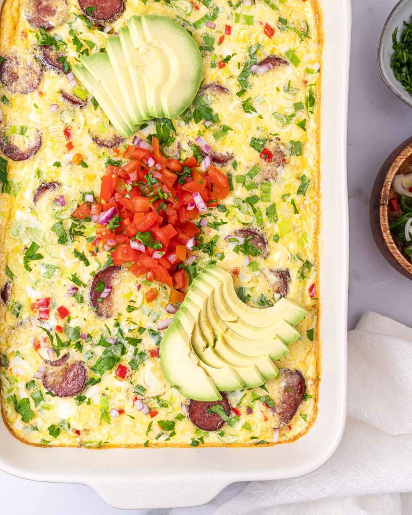 - Top your casserole as desired with tomatoes, red onion, diced avocado, and cilantro, and serve while hot.