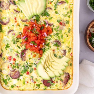 - Top your casserole as desired with tomatoes, red onion, diced avocado, and cilantro, and serve while hot.