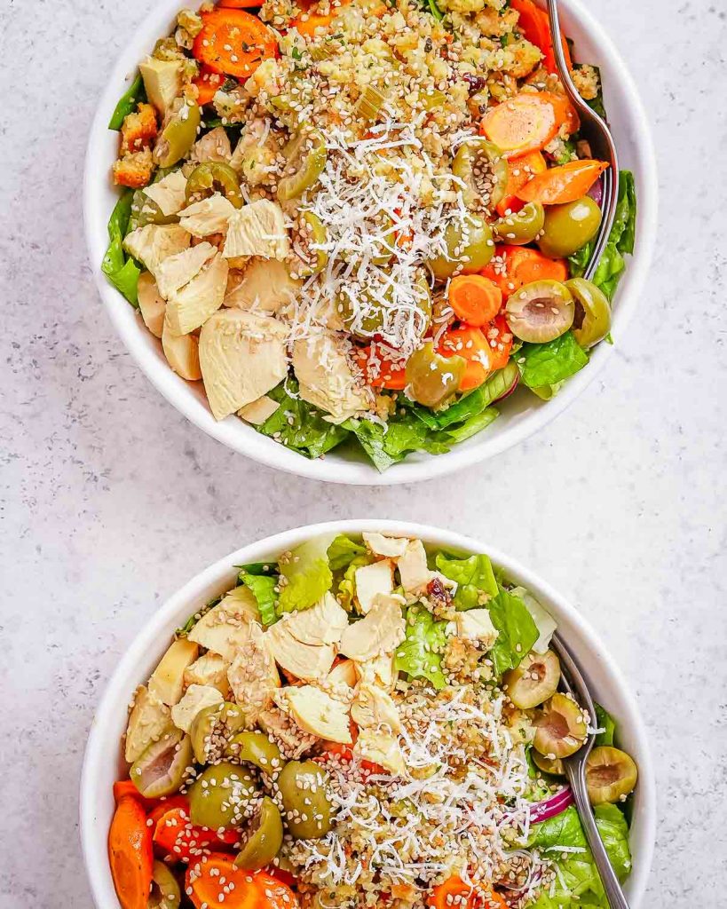 - Equally divide your leftover toppings as desired and add on top of the green salad base.