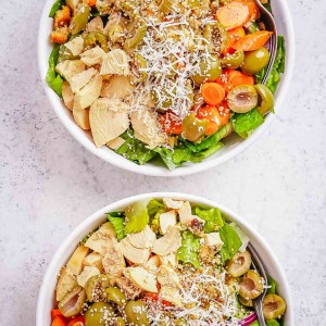 - Equally divide your leftover toppings as desired and add on top of the green salad base.