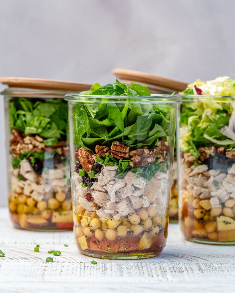 Because they stay fresher this way! As long as you build it in the proper order (very important!) Then you’ll have tasty grab-n-go salads all week!