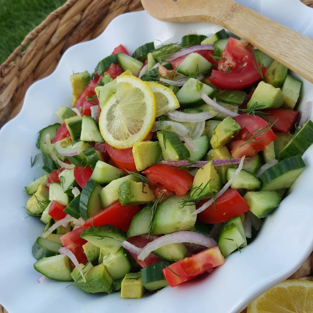 - Place tomatoes, cucumber, red onion, avocado, and fresh dill into a large salad bowl.