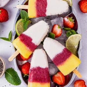 Pour or spoon this strawberry mixture over the frozen coconut mixture into the molds. Freeze for another hour.