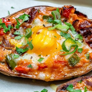 Twice Baked Stuffed Sweet Potatoes with Bacon and Eggs