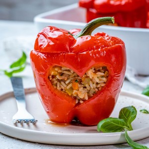 - Once the time is up remove your red peppers from the oven and stuff each with the rice mixture.