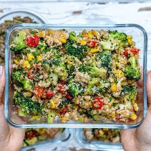 This veggie-packed cauliflower “rice” makes for a really delicious, satisfying, and SUPER quick, one-pan meal to eat immediately; but it’s also one of our favorites for meal prep!