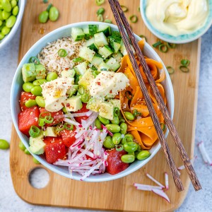 - Top with carrot, fresh cucumber, edamame, radishes, and avocado as shown.