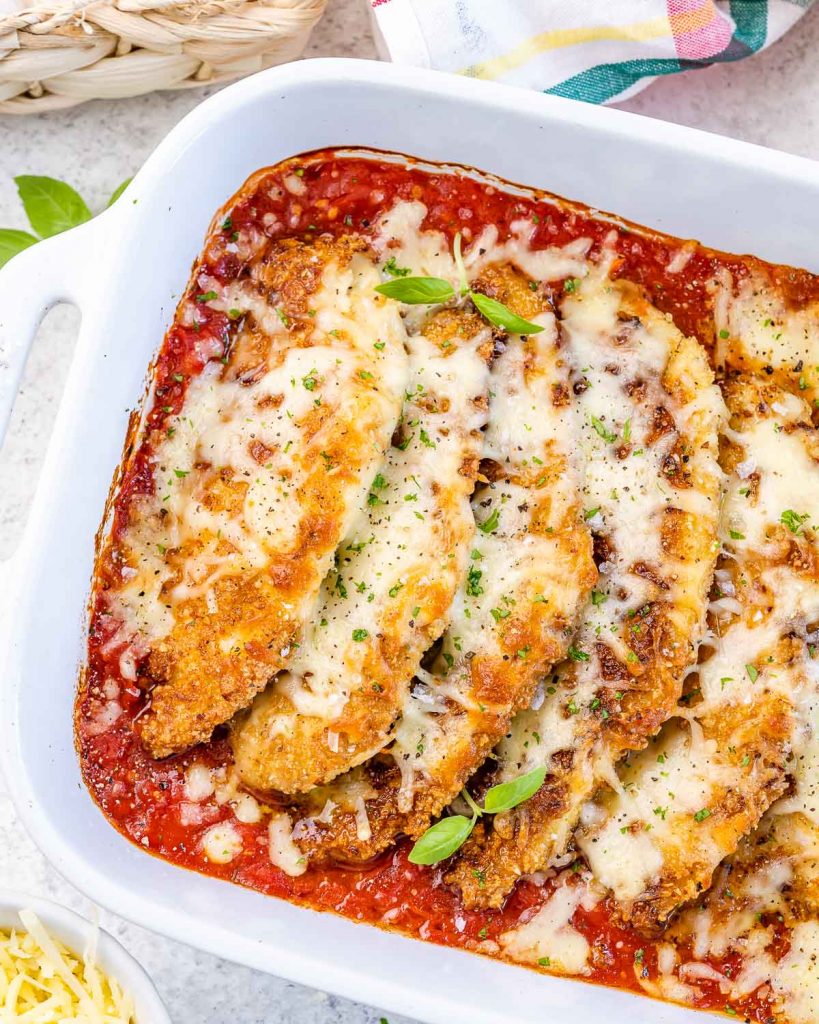 - Transfer your chicken into the prepared baking dish as shown and top with your shredded mozzarella. Bake until your sauce is bubbly and the cheese is melted.