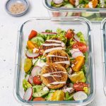 To assemble your bowls, divide the chopped veggies equally among 4 meal prep containers.