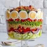Pour over the prepared dressing, and level it up with a rubber spatula. Top with olives, green onions and crumbled bacon.