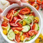 Add tomatoes, cucumbers, and onions into a large glass bowl. Drizzle with your ACV mixture. Gently stir to combine.