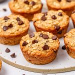 Divide the remaining 1/4 cup of peanut butter, by adding a teaspoon to each muffin. Sprinkle in half of your chocolate chips.