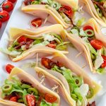 To assemble your antipasto tacos lay a slice of turkey on your clean cutting board.