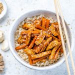 Divide your chicken & carrots equally and serve each portion over 1/2 cup of cooked brown rice, quinoa, or cauliflower rice.