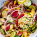 In a large bowl add your thinly sliced beets, cucumber, squash, red onion, parsley, or any combination of your favorite fresh herbs, and pumpkin seeds.