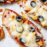 Top your potato crusts with pizza sauce, mozzarella, chicken, jalapeno, and olives as desired.