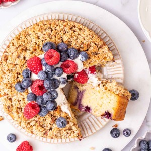 Naturally sweetened vanilla cake with fresh berries baked right into the batter, layered with a delicious, nutty, crisp-crumb topping, then served with more fresh berries and a dollop of yogurt or whipped coconut cream. It’s so good and the perfect “sweet treat” in the morning without being *too* sweet.