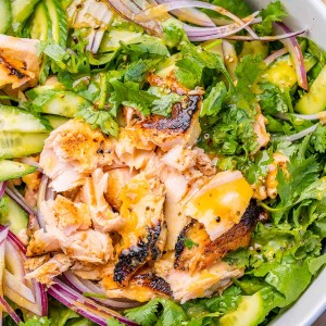 - Meanwhile, in a large bowl (or use 4 single-serving bowls) add your chopped lettuce, cilantro leaves, cucumber, and onion. Drizzle with the reserved dressing and toss.