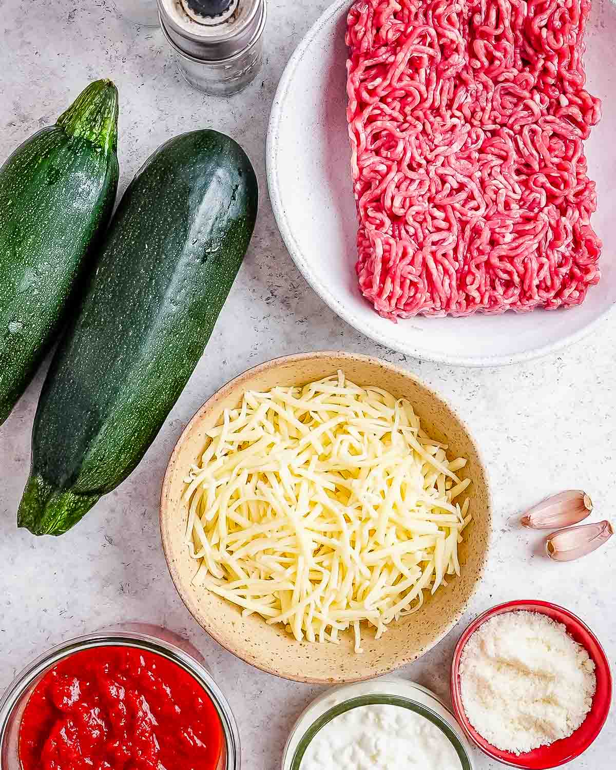 Green zucchinis, ground beef, shredded cheese, marinara, cottage cheese, parmesan cheese and garlic laid out on a white background.